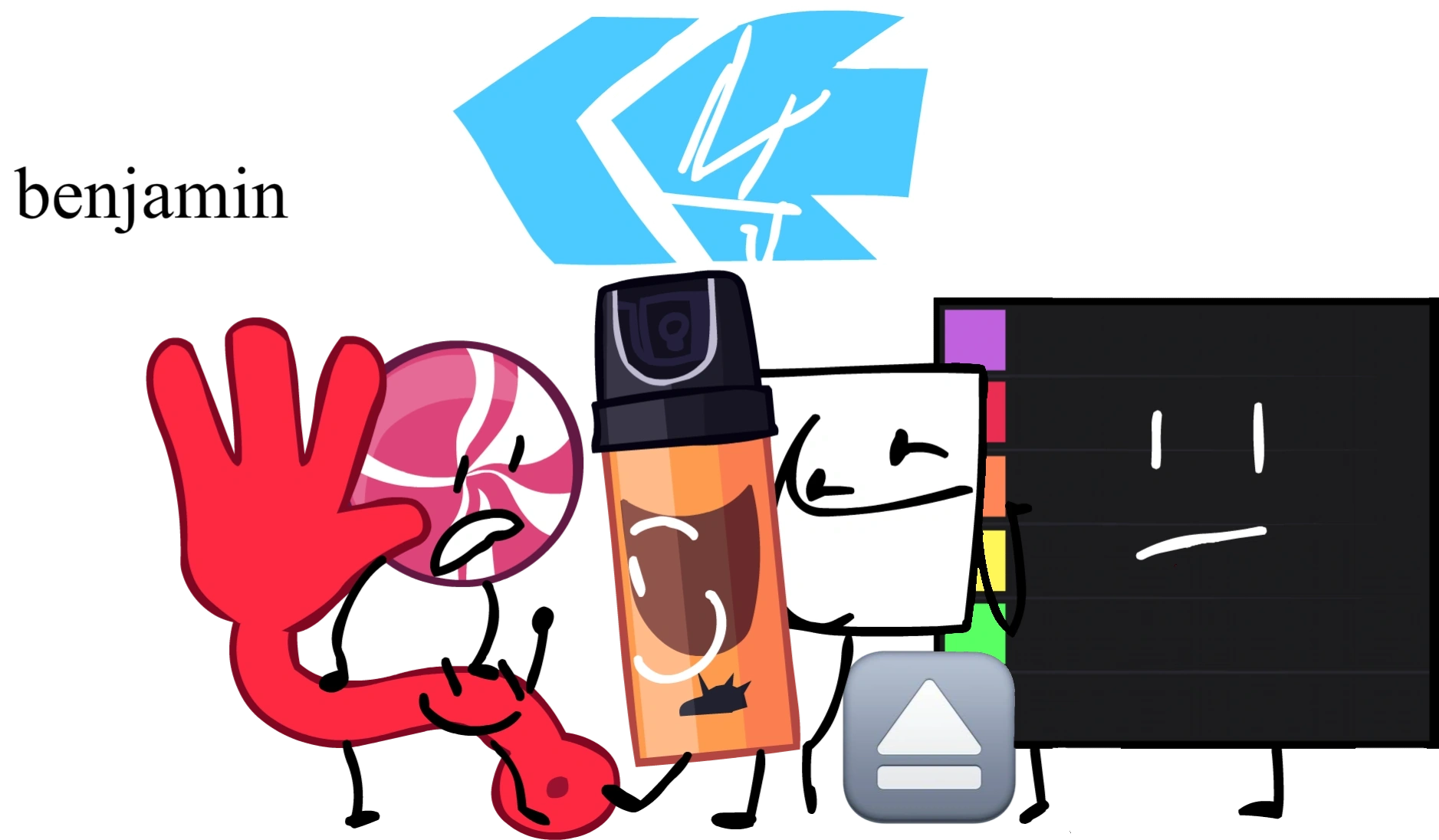 benjamin is first seen when Eject is telling Rainbow Assortment it would be rude to use someone for selfish needs, afterwards, Eject flies towards Shifty where he says that he is treated like trash. Shifty says that's too bad and that he doesn't feel like trash, he then says that Red Sticky Hand feels like trash due to him not being able to save Doorframe last episode. Raid is then wondering how they can make it up to Red Sticky Hand. Raid then gets an idea on how to make it up to Red Sticky Hand, Golden Apple then says that he doesn't know. Shifty then moves Golden Apple out of the way, causing him to crash into Animatic. Later, once Animatic is announcing the challenge, School ID then explains how it is theoretically possible for the world to revolve around everyone. Jej then starts laughing saying that School ID is the living embodiment of the nerd emoji. School ID then calls Jej The living embodiment of a little pestering bug that keeps trying to bite her. despite being too insignificant to do anything in life. Jej is then shocked that School ID called her that. During the challenge, Tiery asks Jej if they're okay, then she says that they were never insulted like that before in life. She then says that she will change for the better, once Jej says that, she moves the locaton of the legs on her body. Jej then asks what's up, once she asks that, a tear from her drops onto the seed. The seed then turns into a sunflower, making benjamin win first place. Peppermint says that Jej should have more epiphanies more often. Shifty then asks Jej what they're favorite location is to double check. Jej then says East Greenland and Shifty welcomes him home.