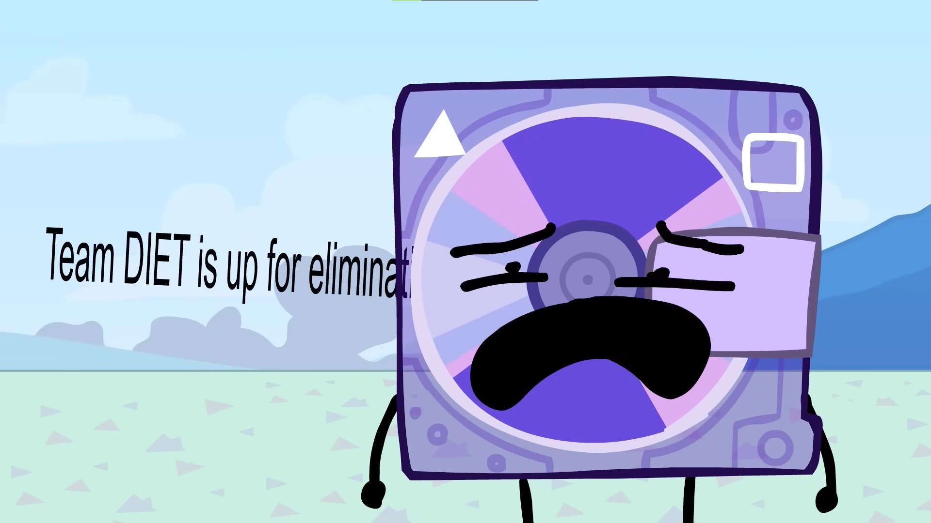 Animatic arrives at the location with his pair of wings. B Block manages to get out and yell to him that his team was in the hole. Dioptase's bush is revealed to be Bush in a Pot, who had been hiding for 8 hours. Tea figures it was best if their team accepted their fate, rather than run from it, saying that "We can delay the inevitable, but that does not change the fact that it was inevitable to begin with." Dioptase quickly accepts her idea and tells Animatic to destroy her. Animatic recalls that one team had lost a member, and another wasn't trapped in a hole. Clay Brick suggests that one contestant should switch teams to make them equal. Animatic tells Clay Brick he really gets him, before killing him by leaning on him. Animatic is unsure of which team he wants to pick to exterminate, while he kills Share, Hive, and Mushroom. Demon Core is shocked at how easily he is able to kill people. Still wondering, Animatic then grabs Notepad and slams him against a brick wall, and rips Printer's paper face in half while wondering if he should get rid of DIET or Happy Meatball. Animatic claims that having both Happy Meatball and Happy Meatbill up for elimination would be redundant, but that DIET is "So smile-tastic". Season 17 suggests that the viewers should decide, and creates his own voting screen between Happy Meatball and DIET. Animatic emerges from Landscape and kills Season 17, which Season 17 claims is because Animatic is jealous. Animatic decides instead to get rid of BOTH teams, and holds out two large human hands to grab them all. Meatball and Oils Paint try to convince B Block to get back inside of the hole, but she doesn't listen. Animatic crushes both of the teams (and Bush in a Pot) in his hands, and then pronounces DIET to be up for elimination alongside Happy Meatbill. Animatic tells his words "Team DIET is up for elimination" to fly, which they respond with "ok".