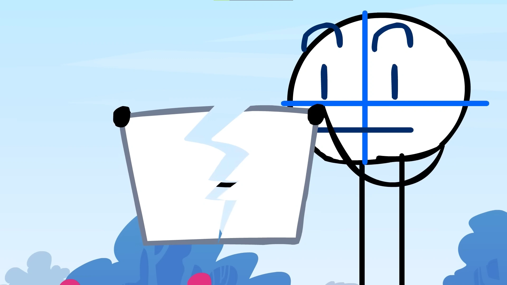 Bob-omb tells his team that he and Eyepatch had figured out a plan to save their team. He starts drawing the plan on a whiteboard with a marker, telling them to imagine a blue line as Animatic. Golden Apple tells him he wouldn't due to not having an imagination. Bob-Omb gets offended, throwing the whiteboard and marker which hit Animatic, alerting him to their position. Tomater asks why the whiteboard didn't hit him, to which Bob-omb answers that Tomater has a problem. Sticky suggests they do something or they’ll all be toast. Animatic takes it literally and sneaks up on Sticky to turn them into a piece of toast, and begins to brutalize the rest of Happy Meatbill one by one. Bowling Ball watches the events unfold, and tries to throw himself at Animatic to protect his friends. However, Animatic effortlessly catches Bowling Ball and drops him, which breaks him into two. Yoshi Egg sticks her tongue out to try to reason with Animatic, who says that that party trick wouldn't work. He then cooks Yoshi Egg's insides and eats them. Animatic announces to the remaining contestants that Happy Meatbill had been entirely exterminated, which meant that their team was up for elimination. He also adds that due to only one team being left, he wouldn't hold back on the killing anymore. Everybody on Grant Swag (except for Notepad) gets inside of Acid's salt circle, hoping that it would save them. In Happy Meatball's hole, B Block starts getting a "mischievous feeling", getting the urge to tell Animatic that they were all inside of the hole. Oils Paint tries to hold her back from running to the surface. B Block notices a cute bush before getting pulled back by Meatball into the hole. Dioptase finds the cute bush, which makes her happy due to it being able to hide her. Weathery gets upset due to the rest of them not being able to fit in the bush, and starts crying. Doorstopper comforts them, telling them that not finding a hiding spot didn't mean they would be killed off.