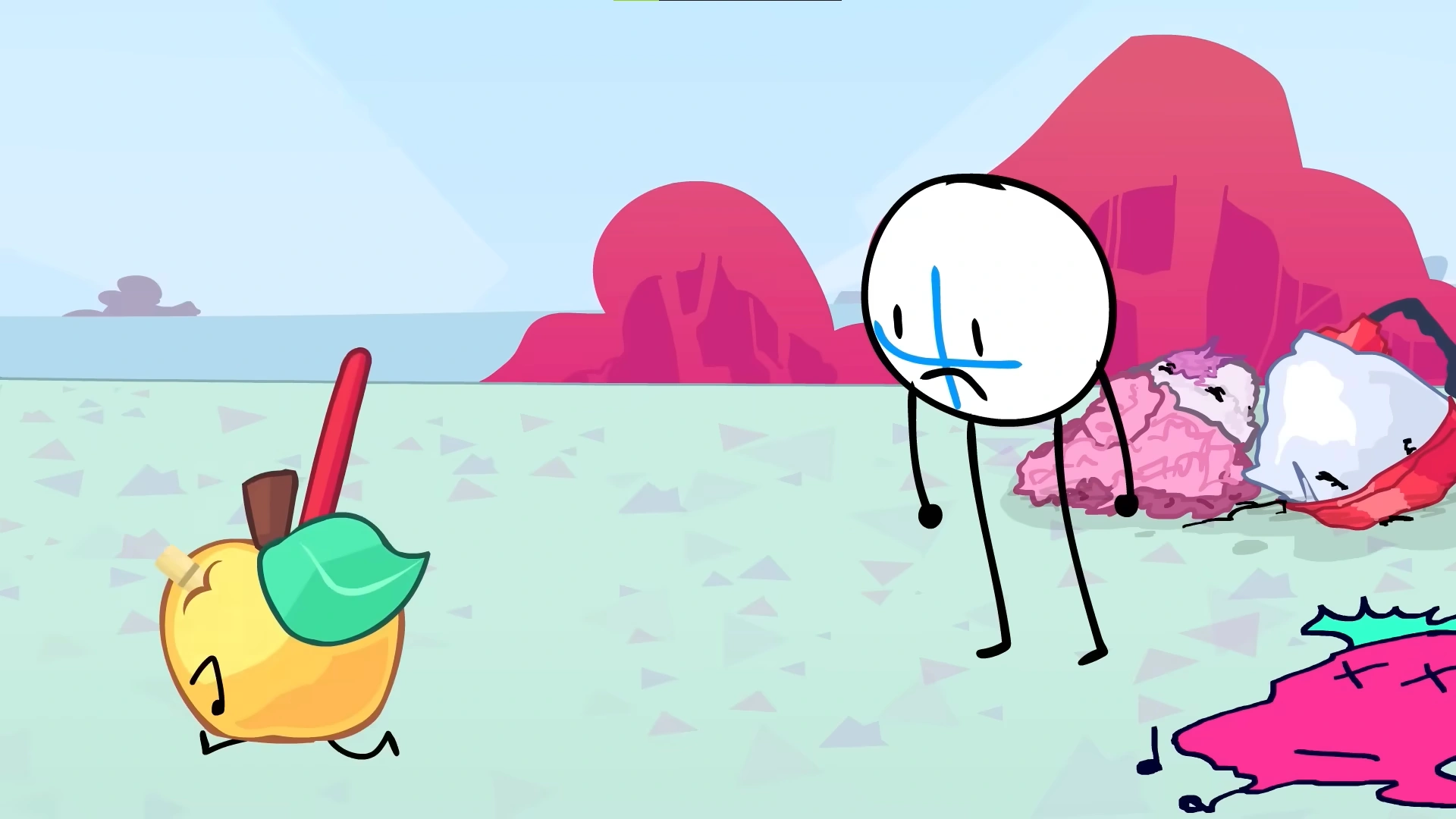 Following the previous episode, Silly Straw continues to walk, wondering if they were doomed to strain against his enemies. He thinks about how even though he lacked in many fields, that he tried his best to win. Silly Straw is then suddenly grabbed by an offscreen hand. Oils Paint pulls him back to the grasslands, telling him she could hear his "yapping" from a mile away. Silly Straw tries to talk with her, but is dismissed due to him speaking in mumbles. Oils Paint walks over to Danger Sign, saying that it was "his fault", before walking away. Danger Sign realizes that it was "his fault" telling Slop about the ordeal. Eggnog Jr. asks what he had done, with him being unable to remember what. Danger Sign asks Iced Coffee what he had done, considering their "caffeinated mind" could remember things better. He tells Danger Sign that wasn't how it worked. Danger Sign asks if they were sure, with Iced Coffee not being entirely sure. Danger Sign grabs Iced Coffee, attempting to pull a piece of coffee out of him. After some struggle, he pulls a piece out, but it goes flying directly near Animatic. Animatic eats it, and begins to violently glitch. The two watch in horror as Animatic goes to the Recovery Microwave and recovers Bowling Ball, before brutally rubbing him down to the point where his face and limbs disappear. Danger Sign realizes that this was his fault, before the two are interrupted by Animatic, kickstarting the intro.