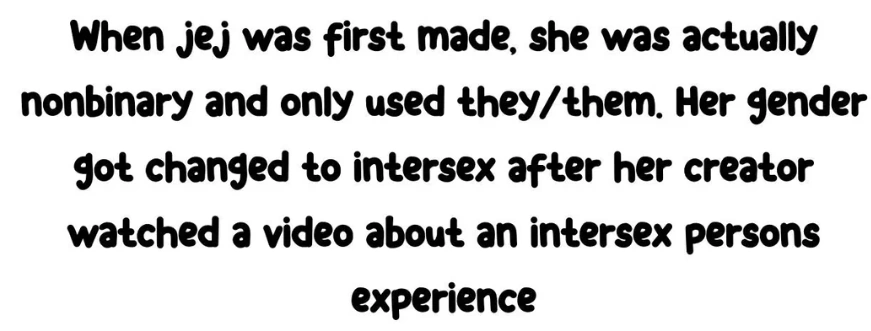 - jej was about to nonbinary with they/them pronouns but was changed to intersex after her creator watched a video about an intersex person's life.[11]