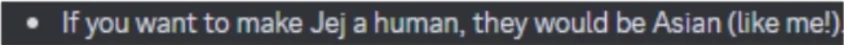- jej's creator confirmed them to be Asian, like his creator. That is if jej was a human.[9]