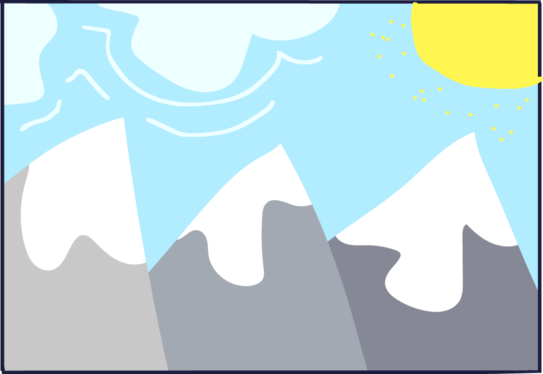 - They are a painting of 3 snow tipped mountains against a blue sky, they also have some clouds in the left, and a yellow sun on the top right.
